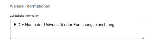 Im Feld „Bemerkungen“ die Zugehörigkeit zur Institution (FID + Name der Universität oder Forschungseinrichtung) angeben.