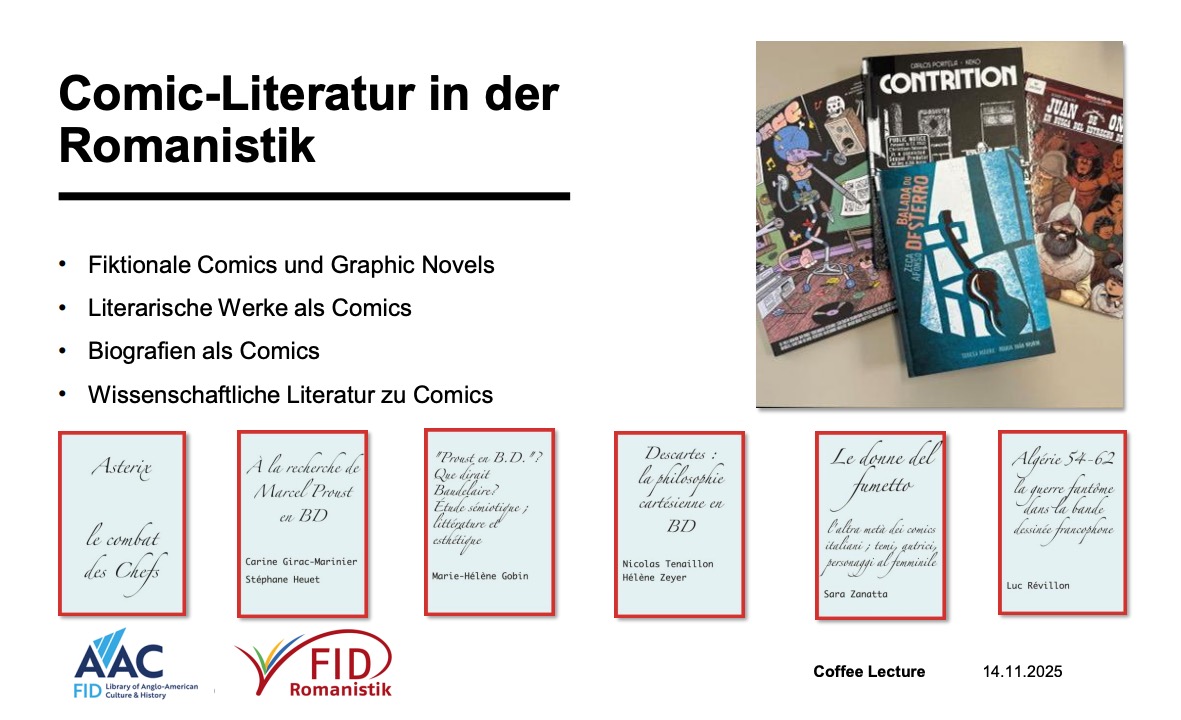 Da wir wissen, dass sich auch die Romanistik in ihrer Forschung umfassend mit Comics und Graphic Novels in der Romania befasst, teilen wir diesen Aufruf. Im Rahmen einer internen Veranstaltungsreihe aller FIDs haben wir gemeinsam mit dem FID Ango-American Culture im November 2025 eine Coffee-Lecture zum Thema „Comic-Sammlungen in den FIDs“ gehalten, deren Folien auf webis veffentlicht wurden: Comic-Sammlungen in den FIDs (Folien, PDF). Deseiteren gibt es auf der Website des FID Romanistik eine im Aufbau befindliche Website mit Informationen zur Auffindbarkeit von Comics und Graphic Novels: Comics, Graphic Novels & Co.