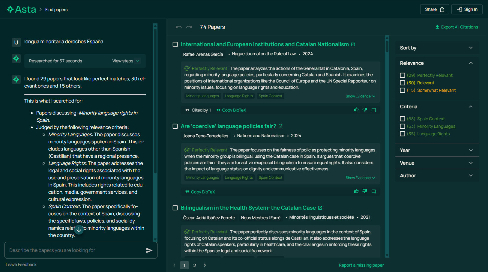 Bei Asta wird die Suchanfrage immer zunächst automatisiert auf Englisch übersetzt und ihr semantischer Gehalt analysiert, woraufhin die offenbar maximal 75 relevantesten Treffer ermittelt und angezeigt werden. Die Ergebnisse sind dadurch unabhängig von der Sprache der Suchanfrage sehr ähnlich, allerdings überwiegt auch hier deutlich die Anzahl englischsprachiger Quellen, die in der Datenbank von Semantic Scholar die große Mehrzahl der Inhalte auszumachen scheinen. Auch der Bereich „Generate a report“ von Asta arbeitet mit einer Übersetzung der Suchanfrage ins Englische. Die darauf aufbauend erstellte Volltextantwort ist teils in der Sprache der Suche abgefasst, bei Anfragen auf Deutsch und Italienisch jedoch auf Englisch. Die verlinkten Quellen sind wiederum jeweils fast ausschließlich englischsprachig. Versuche, dies durch eine Erweiterung des Prompts um die Bitte nach Quellen in einer bestimmten Sprache zu ändern, bleiben erfolglos. Im Bereich „Find papers“, wo eine Suchanfrage mit einer reinen Trefferliste beantwortet wird, ist dies jedoch anders. Gibt man dort eine vollständige Frage als Suche ein und ergänzt sie um die Bitte, wissenschaftliche Artikel in einer bestimmten Sprache zu finden, funktioniert es gut, dass die Mehrzahl der Treffer in der genannten Sprache abgefasst ist und nur noch ein kleinerer Teil englischsprachiger Publikationen angezeigt wird. Als freies und unbegrenzt ohne Registrierung nutzbares Tool ist Asta zur Auswertung der Datenbank von Semantic Scholar nicht uninteressant. Für umfassende Recherchen erweist sich das Suchportal des FID Romanistik bislang aber als die ergiebigste Quelle für fachlich einschlägige Publikationen und sollte daher nicht durch die Nutzung KI-gestützter Recherchetools ersetzt werden. Wünschenswert und durchaus nicht unrealistisch ist zudem, dass die beiden Welten der wissenschaftlichen Recherche sich in den nächsten Jahren einander weiter annähern und bestehende Suchinstrumente mit von Bibliotheken kuratierten Metadaten um Recherchefunktionen mit KI-Unterstützung erweitert werden.
